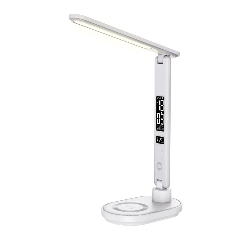 Cette lampe de bureau est conçue pour faciliter votre quotidien. Elle intègre une fonction de charge par induction. Il vous suffit de placer votre smartphone compatible sur la base et la charge commence automatiquement. Equipé d’un écran LCD, elle vous affiche l’heure, la date, le jour de la semaine et la température ambiante. Son bras pliable et orientable vous offre une grande flexibilité pour ajuster l’éclairage selon vos besoins. Vous réglerez facilement la couleur et l’intensité lumineuse par simple appui. La technologie LED garantit une efficacité énergétique et une longue durée de vie. Cette lampe vous séduira avec sa finition de qualité et apportera une touche élégante et sobre à votre intérieur.