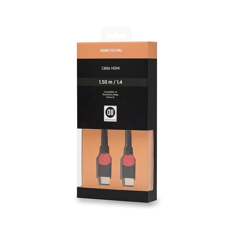 D2 Diffusion HDMI/150 MU. Longueur de câble: 1,5 m, Connecteur 1: HDMI Type A (Standard), Genre de connecteur 1: Mâle, Connecteur 2: HDMI Type A (Standard), Genre de connecteur 2: Mâle, Contacts du connecteur de placage: Or, Version HDMI: 1.4, Canal de retour audio (ARC, Audio Return Channel), Couleur du produit: Noir, Rouge