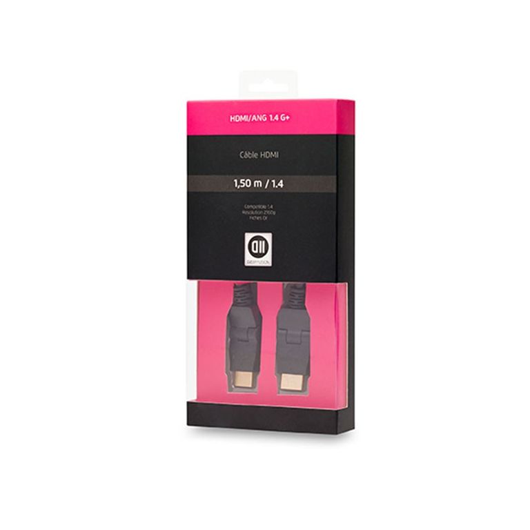 D2 Diffusion D2HDMI150ROT. Longueur de câble: 1,5 m, Connecteur 1: HDMI Type A (Standard), Genre de connecteur 1: Mâle, Connecteur 2: HDMI Type A (Standard), Genre de connecteur 2: Mâle, Contacts du connecteur de placage: Or, Version HDMI: 1.4, Compatibilité 3D, Couleur du produit: Noir