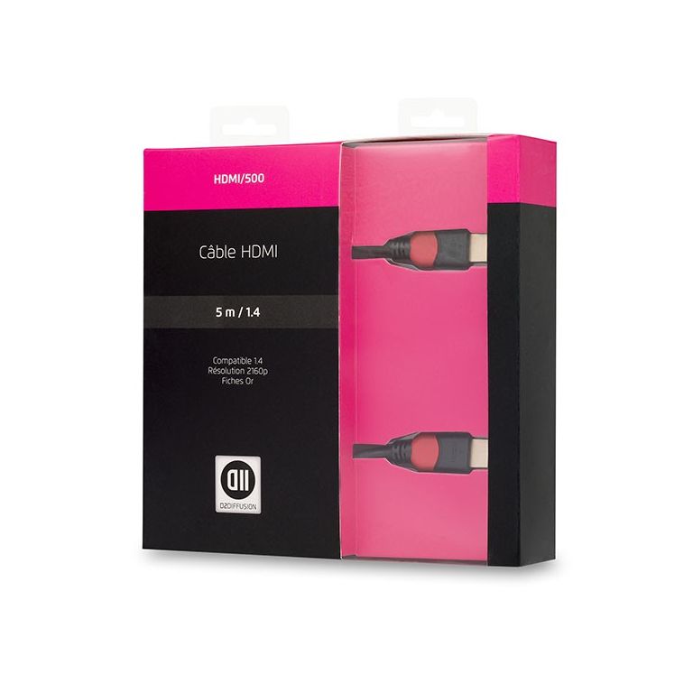 D2 Diffusion D2HDMI500. Longueur de câble: 5 m, Connecteur 1: HDMI Type A (Standard), Genre de connecteur 1: Mâle, Connecteur 2: HDMI Type A (Standard), Genre de connecteur 2: Mâle, Contacts du connecteur de placage: Or, Version HDMI: 1.4, Compatibilité 3D, Couleur du produit: Noir, Rose