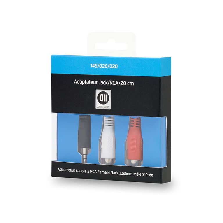 D2 Diffusion D2JKRCAF020. Connecteur 1: 3,5mm, Genre de connecteur 1: Mâle, Connecteur 2: 2 x RCA, Genre de connecteur 2: Femelle, Contacts du connecteur de placage: Or, Longueur de câble: 0,2 m, Couleur du produit: Noir