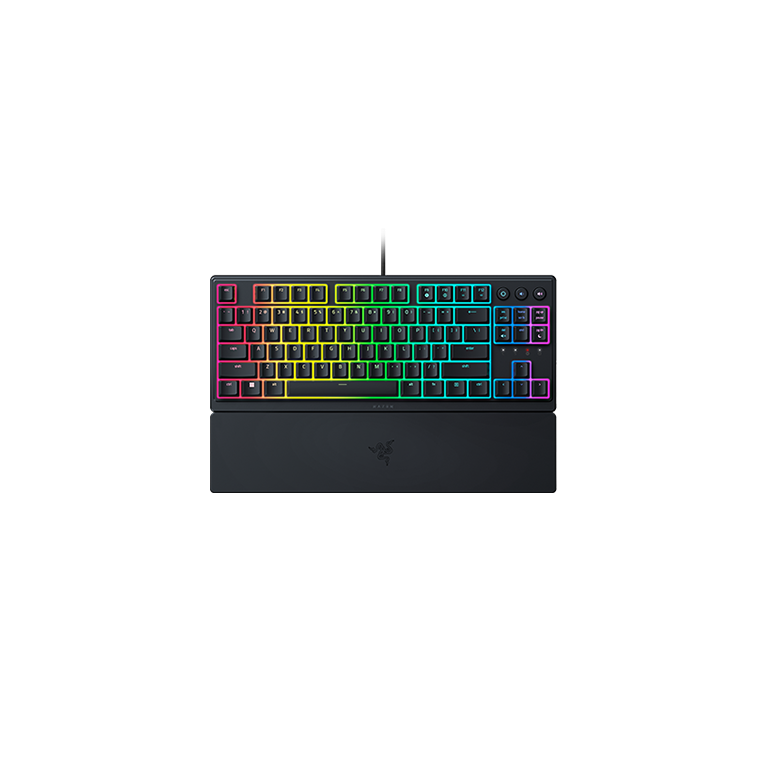Razer Ornata V3 Tenkeyless. Facteur de forme du clavier: Sans clé (80 - 87%). Style de clavier: Droit. Technologie de connectivité: Avec fil, Interface de l'appareil: USB, Interrupteur à clé de clavier: Interrupteur à clé mécha-membrane, Disposition des touches du clavier: AZERTY. Type de rétro: LED RGB. Utilisation recommandée: Gaming. Couleur du produit: Noir