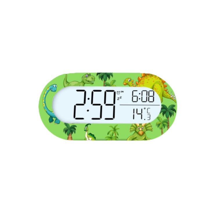 Réveil numérique WeKids au design ludique avec un motif Dino, doté d’un écran rétro-éclairé offrant un affichage clair de l’heure et de la température. Fonctionnant sur piles, il est facile à placer sans contrainte de câble et parfaitement adapté à une chambre d’enfant, alliant praticité, lisibilité et univers décoratif apaisant.
